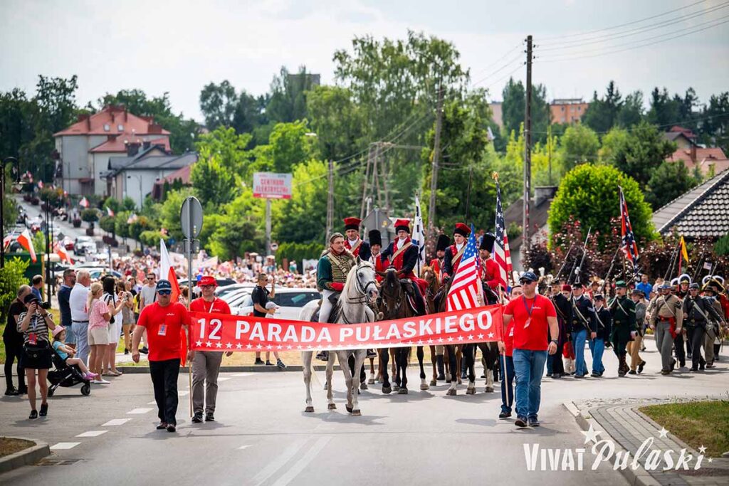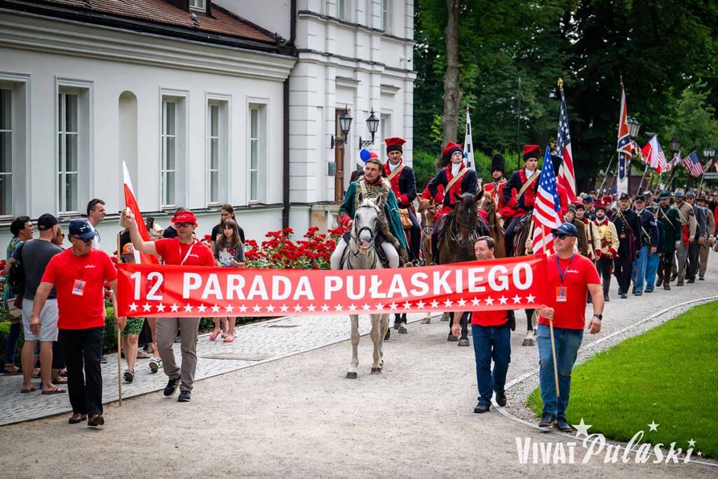 Na czele parady jechał na koniu Kazimierz Pułaski, w którego wcielił się Damian Dębski – aktor i kaskader, świetny jeździec. Za nim podążali konno i pieszo rekonstruktorzy historyczni: kawaleria z XVIII w. – polska i carska, którą zagrali jeźdźcy z Gulina koło Radomia i Pionek, konfederaci barscy, w których wcielili się harcerze z Rzeszowa, XVIII w. artylerzyści rosyjscy – w tej roli pasjonaci historii z Józefowa. Za polską szlachtę wcieliły się współpracujące z muzeum wolontariuszki (m.in. z Zespół Szkół im. 1 Pułku Lotnictwa Myśliwskiego „Warszawa” w Warce). Z uwagi na przypadającą w tym roku 160. rocznicę zakończenia wojny secesyjnej w USA – na paradzie mogliśmy zobaczyć żołnierzy z pułków reprezentujący „Północ” oraz „Południe”, a także  Indian Huu-Ska Luta – rdzennych  mieszkańców Ameryki Północnej, w których z powodzeniem od lat wcielają się miłośnicy tej kultury z Torunia. Wszyscy podążali na wareckie Winiary, by tam zaprezentować swoje umiejętności, przybliżyć zwyczaje oraz podzielić się pasją i wiedzą z gośćmi wydarzenia.