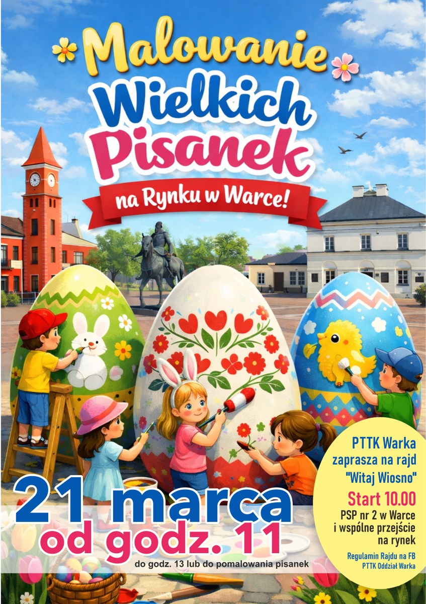 Już w sobotę 21 marca zapraszamy mieszkańców Warki i okolic na radosne, wiosenne wydarzenie – Malowanie Wielkich Pisanek na Rynku w Warce.